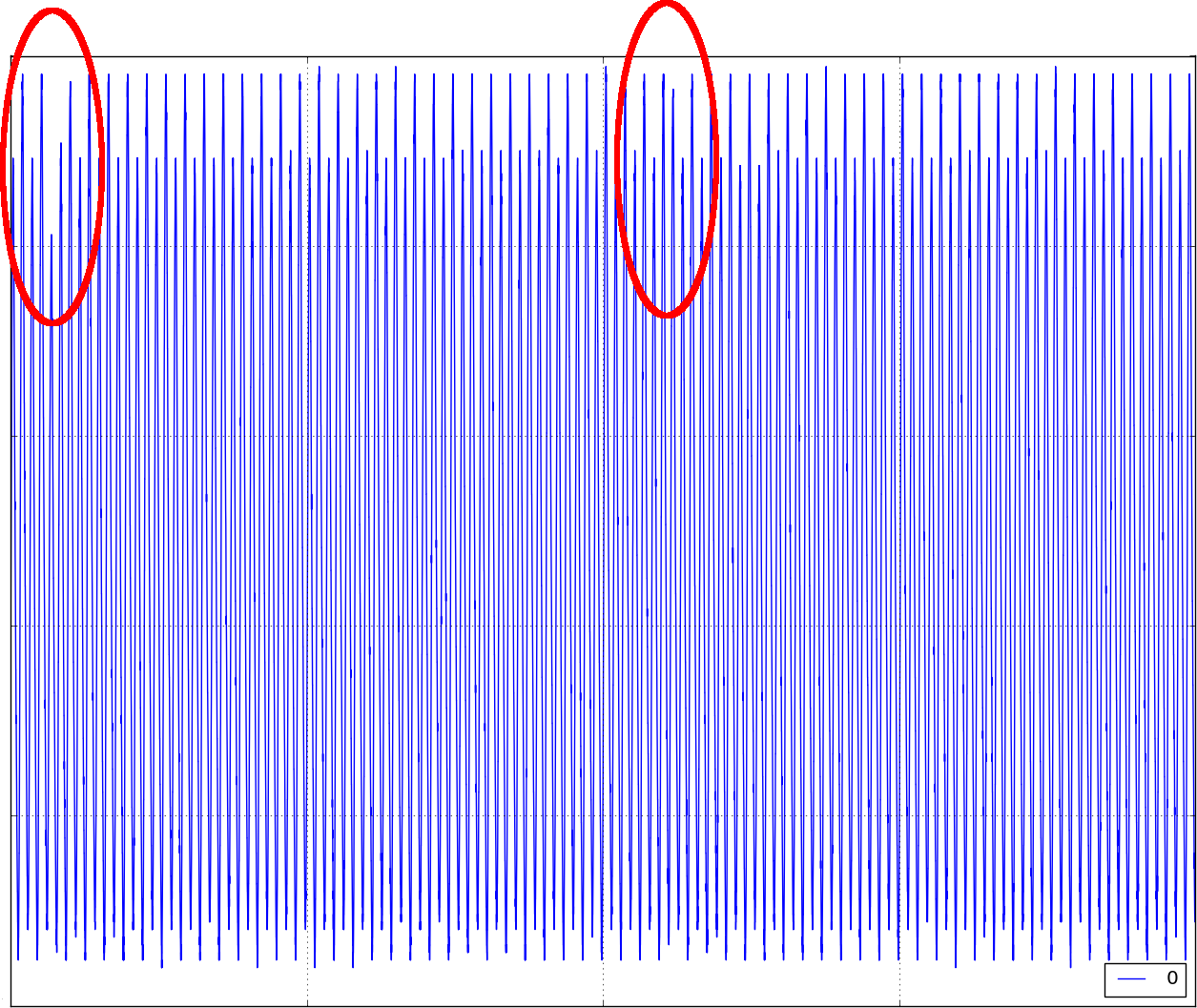 Step through the peaks counting high/low/high/low until you find a double peak (high/low/low/high or low/high/high/low). This is where the card changed which bit it is broadcasting! See the circled double peaks on this sample reading. If you are patient enough, you can read the whole sequency by hand this way. However, it would be a lot more convenient to export data from the oscilloscope to a computer and have the computer do the boring work for you. We experimented with several systems for parsing ID bits from scope data automatically. Here is a script that uses a low pass filter and hysteresis to identify peaks and reads bits the same way I do it manually on the oscilloscope.
