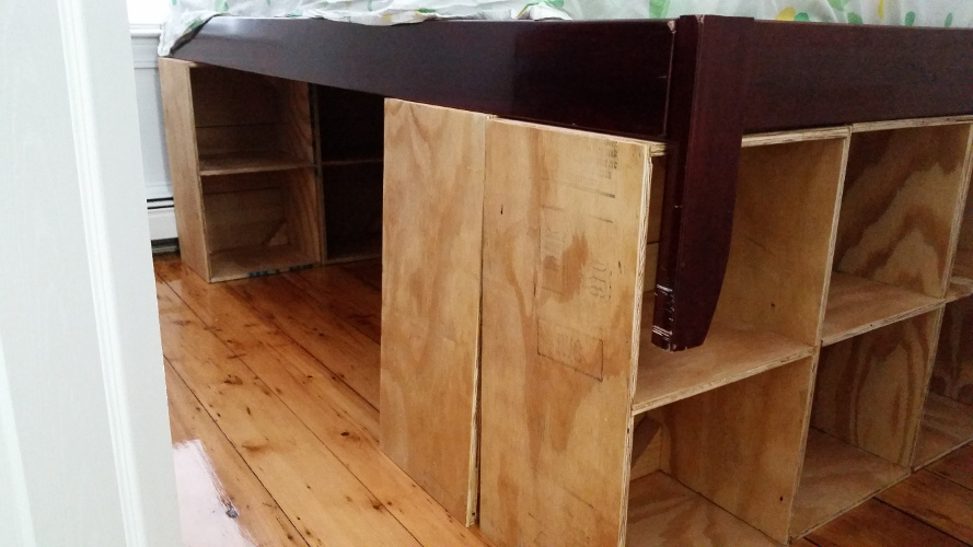 Now that I’ve moved into my apartment I need to find somewhere to store all my stuff. My room is really small, so this requires some creativity. I decided to set up furniture so I could store all my stuff under my bed. Unfortunately, beds with drawers under them are really inefficeint (they waste so much volume!) and it turns out no one sells furniture that tiles nicely under a twin bed. So I decided to make my own.