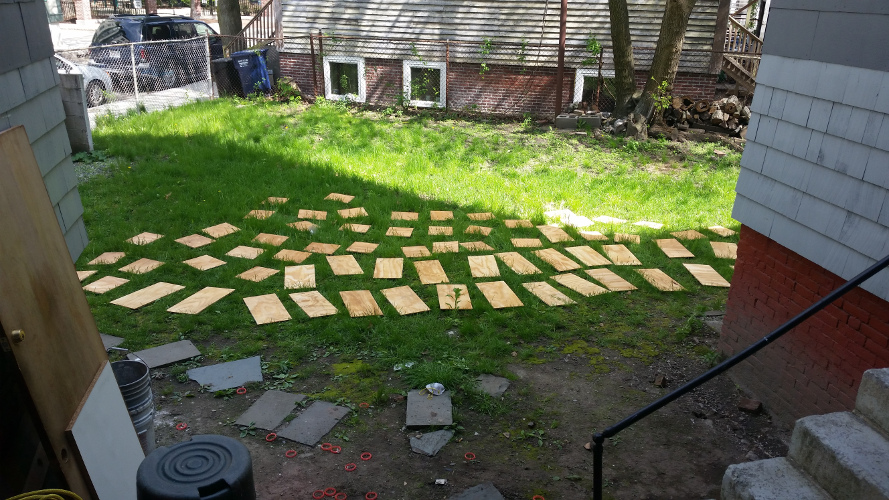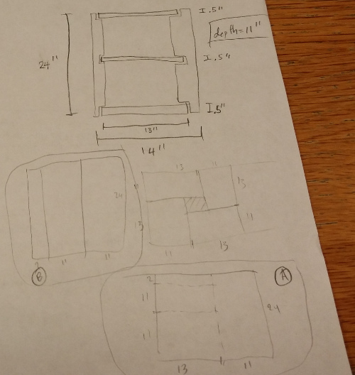 Now for materials. I need 11 cubbies. Each cubby has 3 shelves, for a total of 33 shelves. Layout A produces 2 shelves (B produces 0), so I need at least 17 As. I need 11 * 2 = 22 sides (and now have 17 from the As), so I need at least 3 Bs (2 sides each). That’s a total of 20 2x2 squares. I get 8 2x2 squares per 4x8 sheet, so I need 3 sheets and get 4 extra squares. With 20 As and 4 Bs that’s enough for about 13 and a half cubbies. I found a 4x8 then sheet of … something at Home Depot I could use as a backing (one is enough for 14 cubbies).