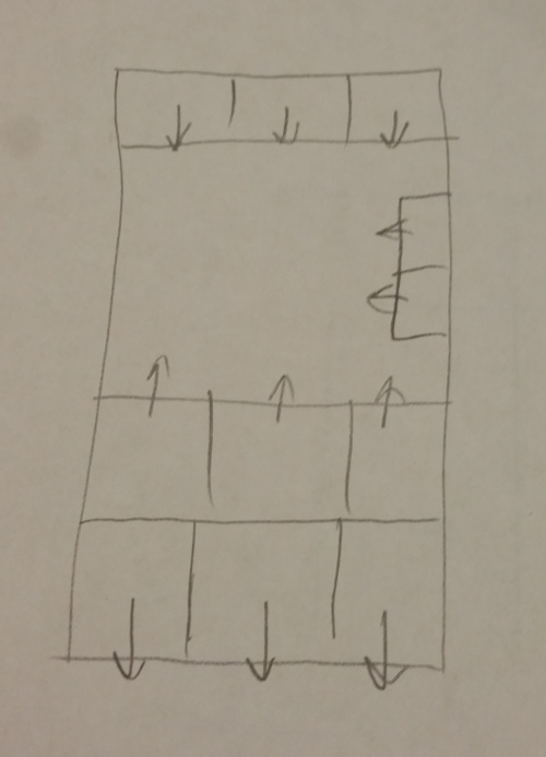 The biggest problem with the IKEA Expedit bed is that the cubbies in the back aren’t easily accessible. Either the bed needs to be placed so neither long edge is next to a wall or the cubbies need to be arranged so that all of them are accessible from one side. I chose the later option. Here is my final layout (top view, arrows point in the direction the cubbies open):