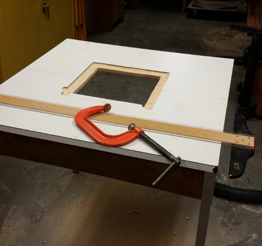 Take a table and cut a hole in the middle to mount your router. You wish you had a router table for this part, but you don’t so you have to do it by hand. (For some reason none of the guides suggest using a friend’s router table or your other router table (“Step one: cut a hole for your new router table using your old router table”)).