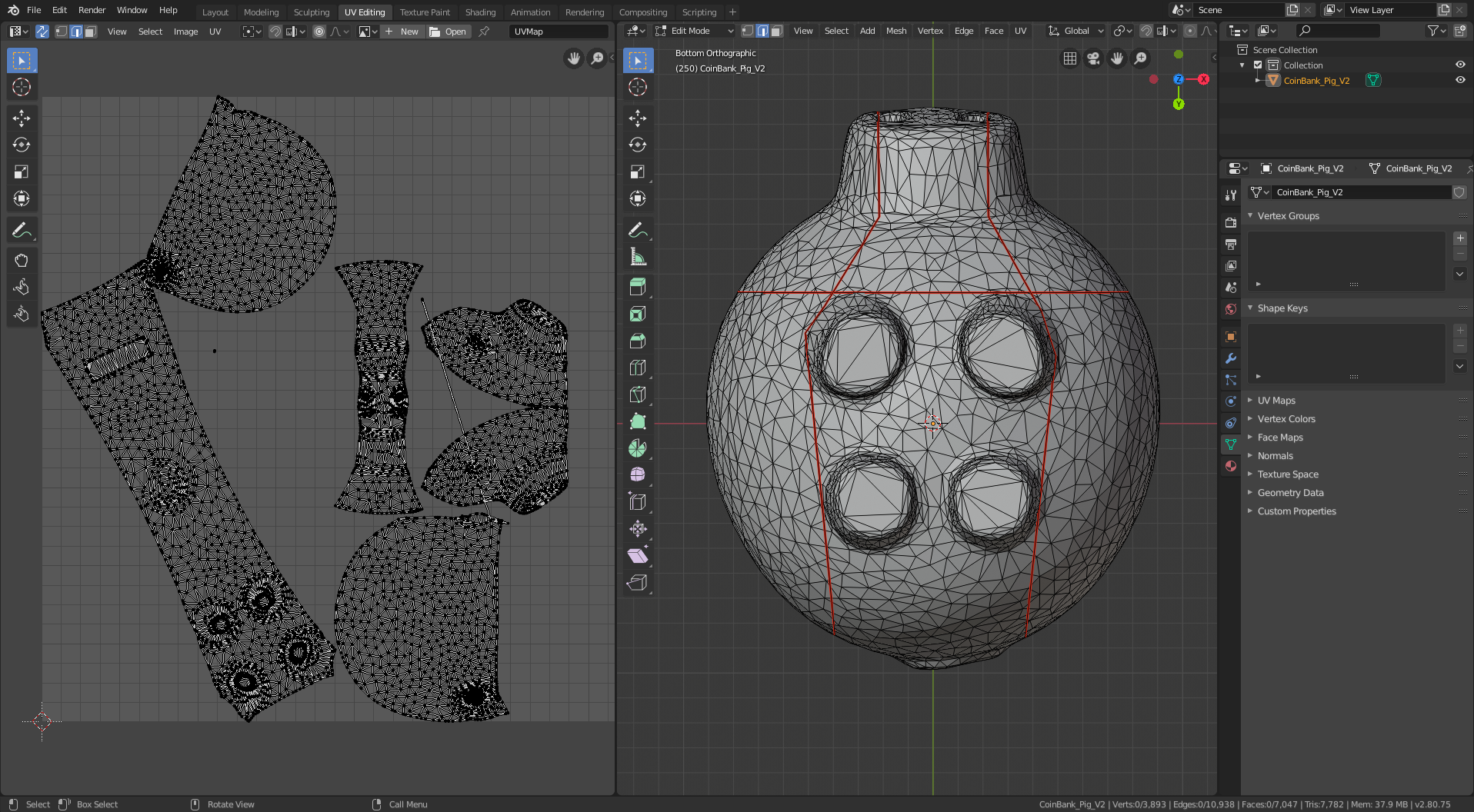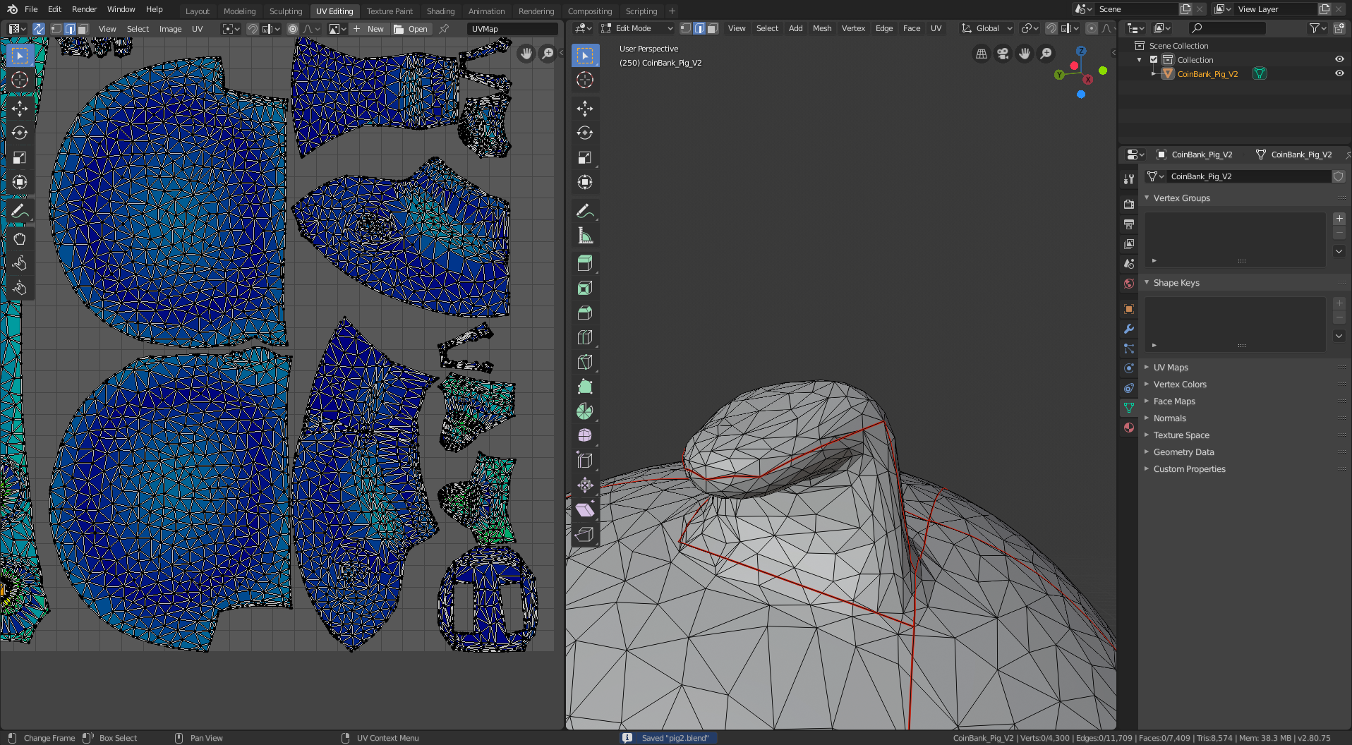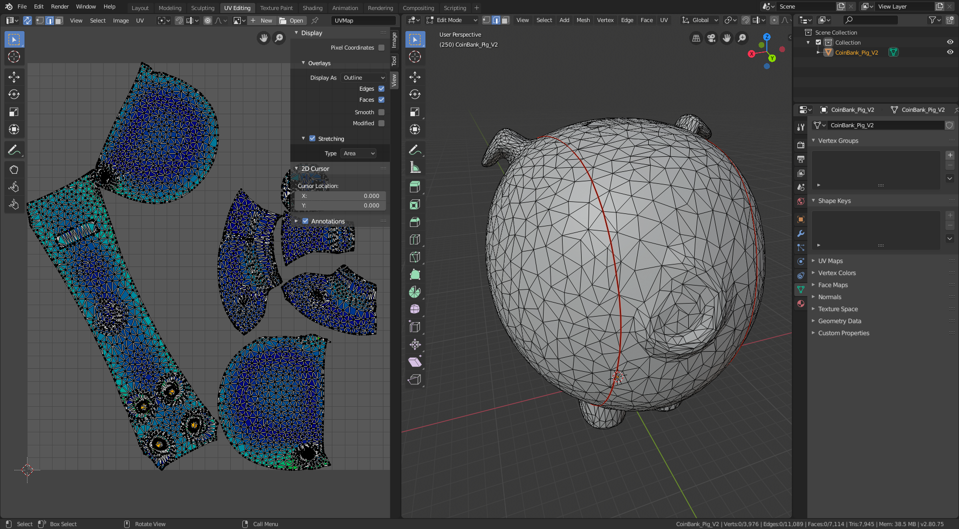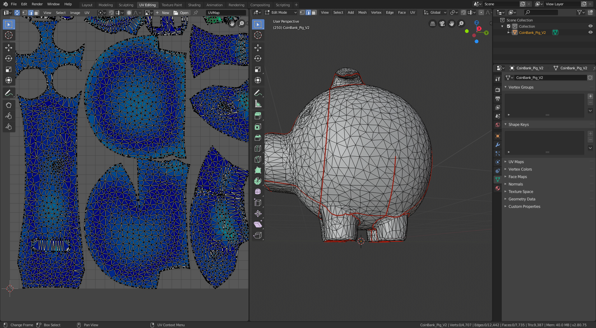 I started with this 3D model of a pig. It’s a piggy bank, so I had to do a little additional processing to remove the hole in the top (and the inner shell that gives it thickness). I also smoothed out the tail and eyes and filled in the nostril holes because I didn’t want them to stick out from the surface of the model in my sewing patterns. The remainder of the manipulation is creating cuts (yes, that’s the UV-mapping terminology – it’s borrowed from sewing!) to segment the 3D model into separate panels, each of which folds flat (i.e. can be cut from a sheet of cloth).
