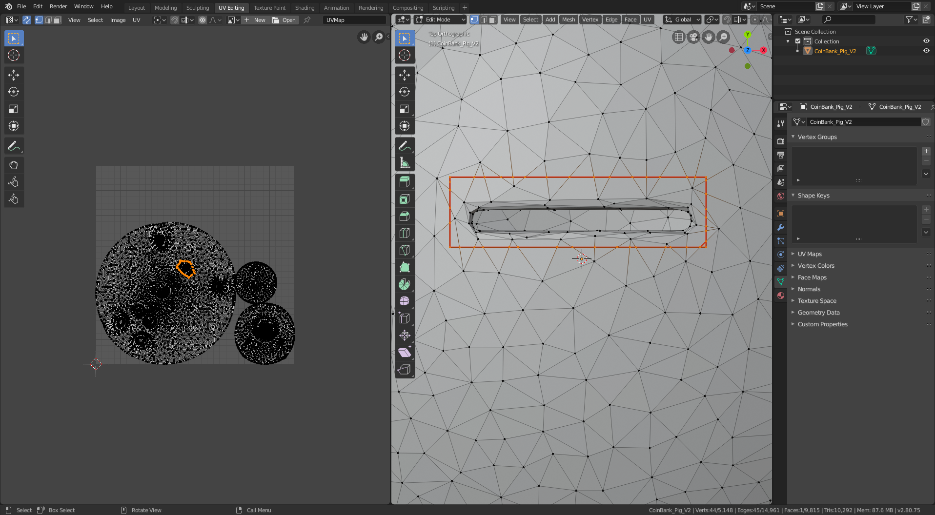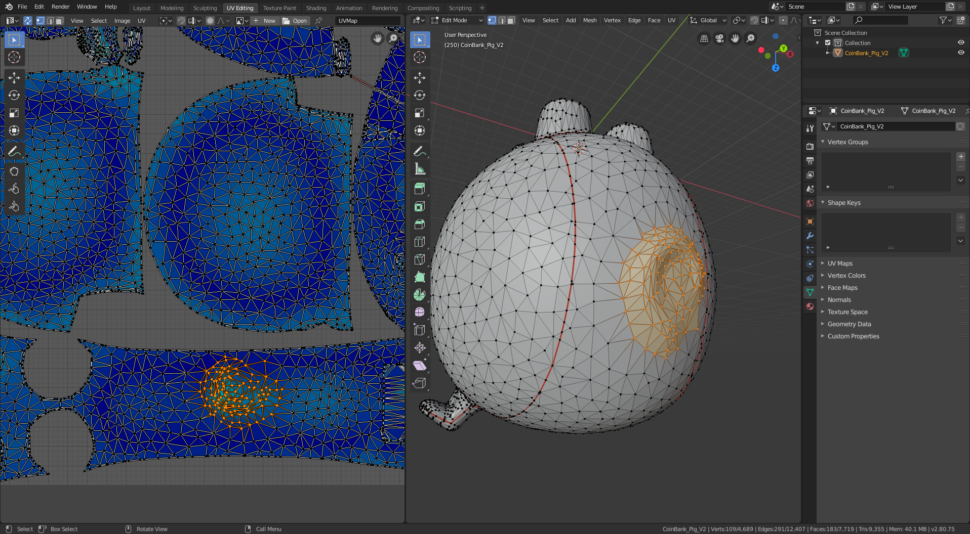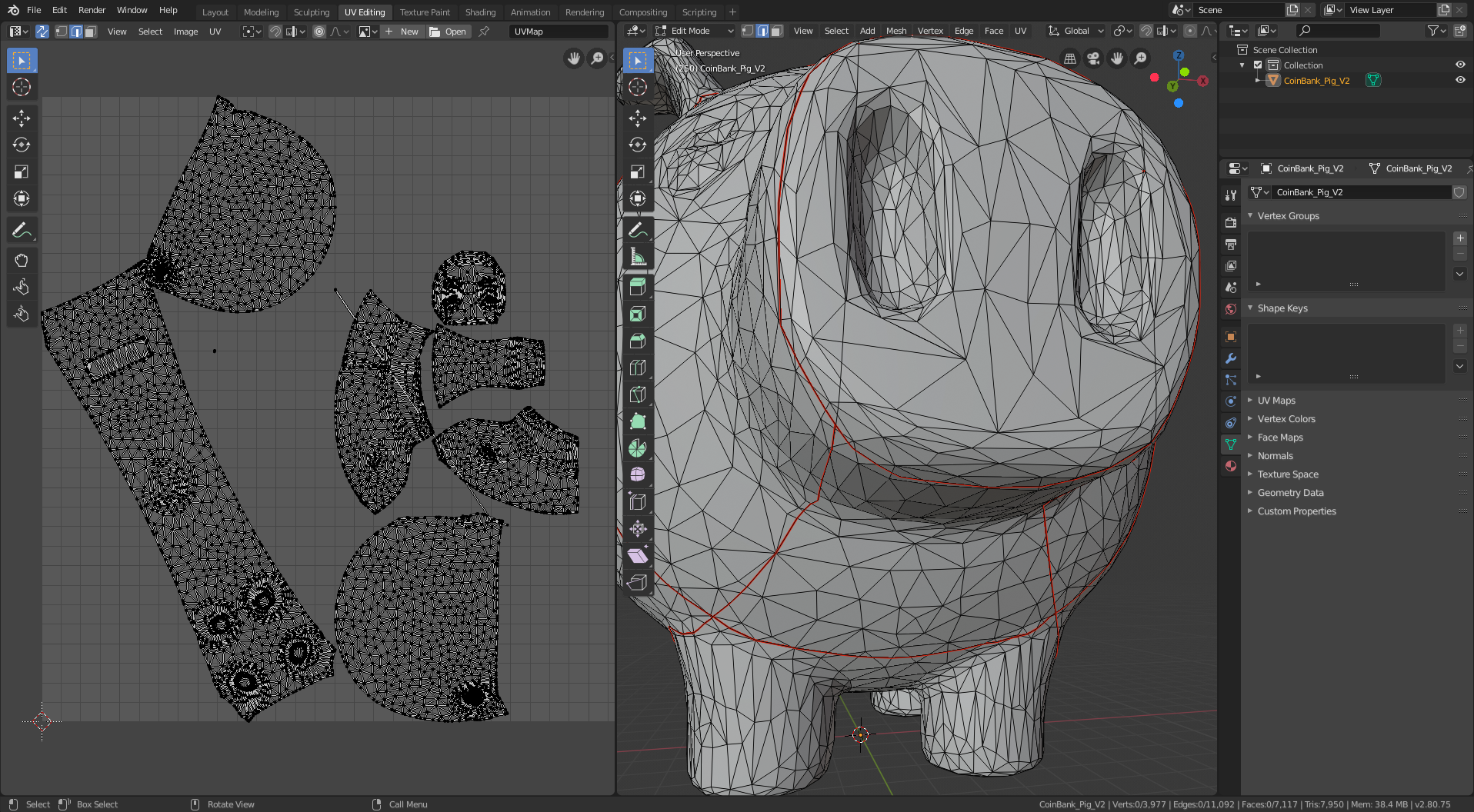 I started with this 3D model of a pig. It’s a piggy bank, so I had to do a little additional processing to remove the hole in the top (and the inner shell that gives it thickness). I also smoothed out the tail and eyes and filled in the nostril holes because I didn’t want them to stick out from the surface of the model in my sewing patterns. The remainder of the manipulation is creating cuts (yes, that’s the UV-mapping terminology – it’s borrowed from sewing!) to segment the 3D model into separate panels, each of which folds flat (i.e. can be cut from a sheet of cloth).