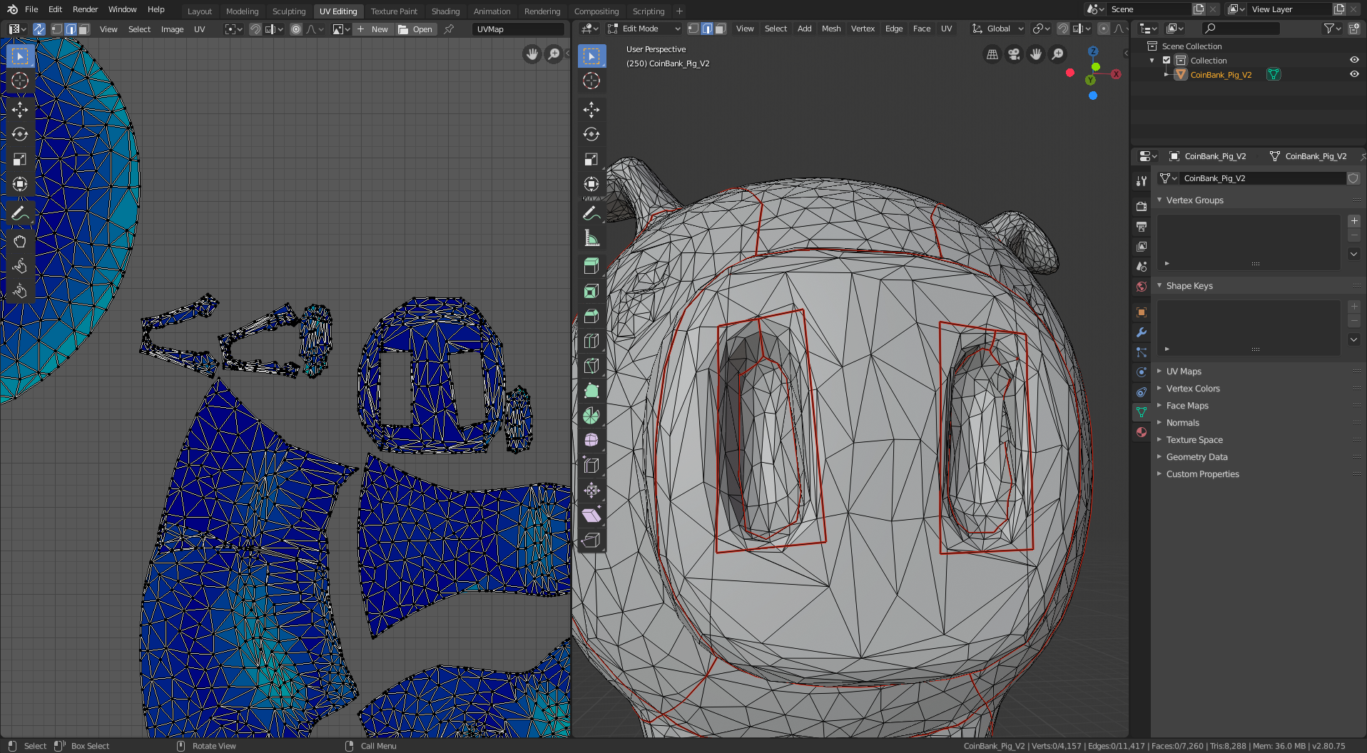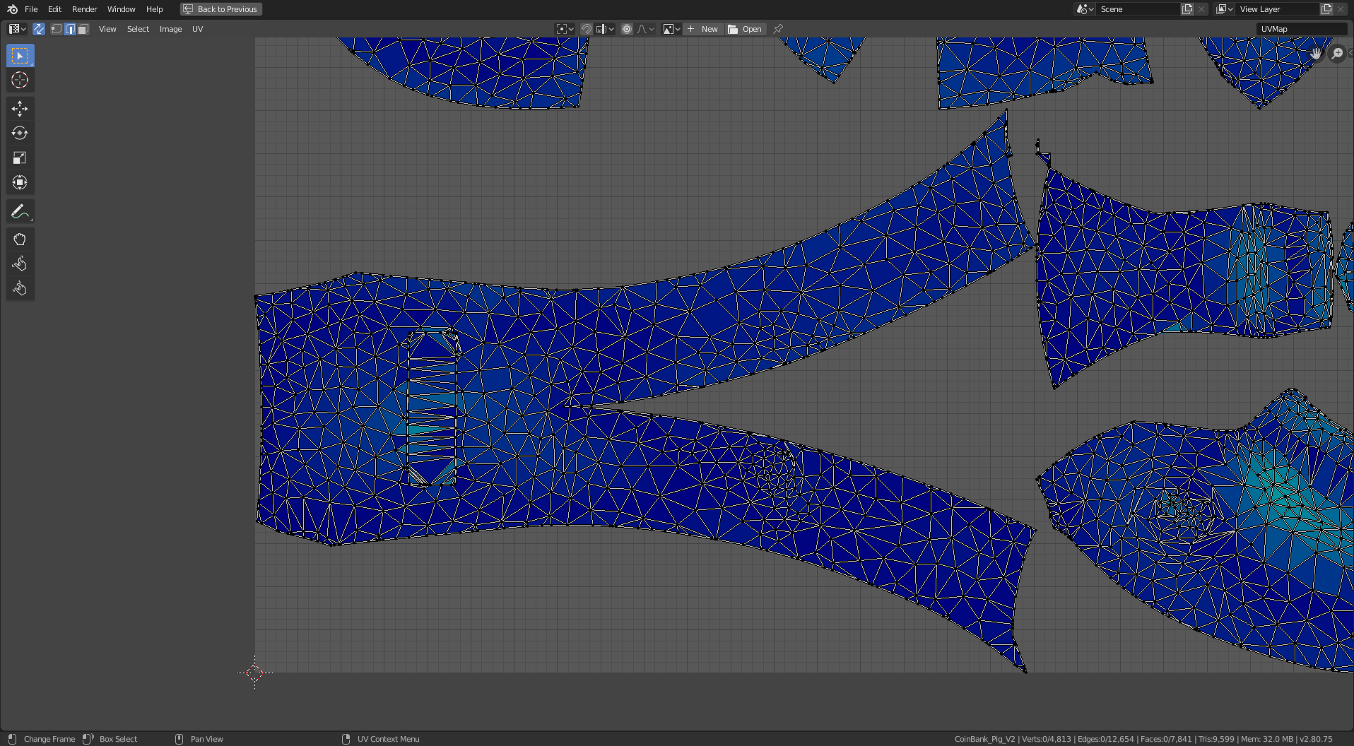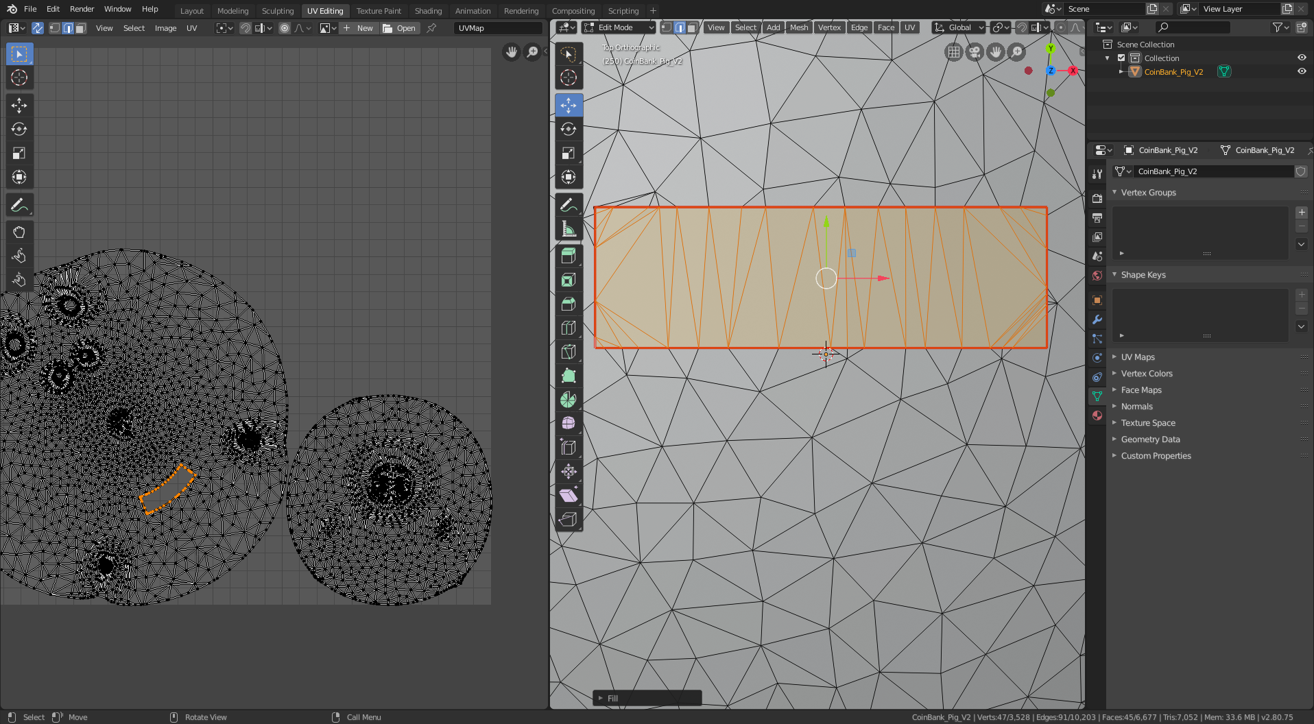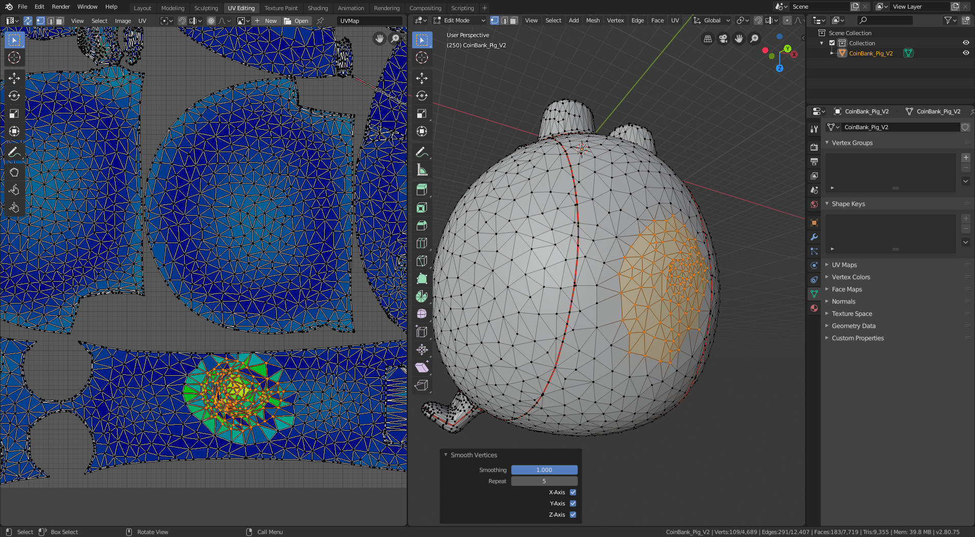 I started with this 3D model of a pig. It’s a piggy bank, so I had to do a little additional processing to remove the hole in the top (and the inner shell that gives it thickness). I also smoothed out the tail and eyes and filled in the nostril holes because I didn’t want them to stick out from the surface of the model in my sewing patterns. The remainder of the manipulation is creating cuts (yes, that’s the UV-mapping terminology – it’s borrowed from sewing!) to segment the 3D model into separate panels, each of which folds flat (i.e. can be cut from a sheet of cloth).